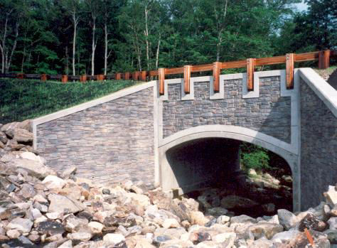 Town of Hartland – The Dish Mill Road Bridge, featuring form liner concrete wingwalls and fascia with a precast concrete arch, as well as steel backed wood guide rail blends well with the surrounding DEEP forest land and recreational pond.